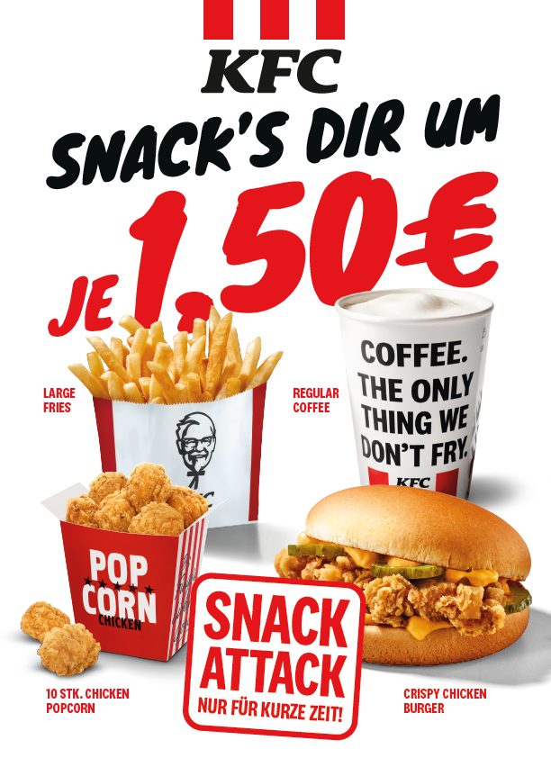 Jetzt gibt’s Deine Lieblingssnacks wie Chicken Popcorn, Crispy Chicken Burger, Pommes und sogar Kaffee für jeweils nur 1,50€. Perfekt für den kleinen Hunger zwischendurch! Worauf wartest du noch? Komm vorbei und schnapp Dir Deinen Snack-Deal!