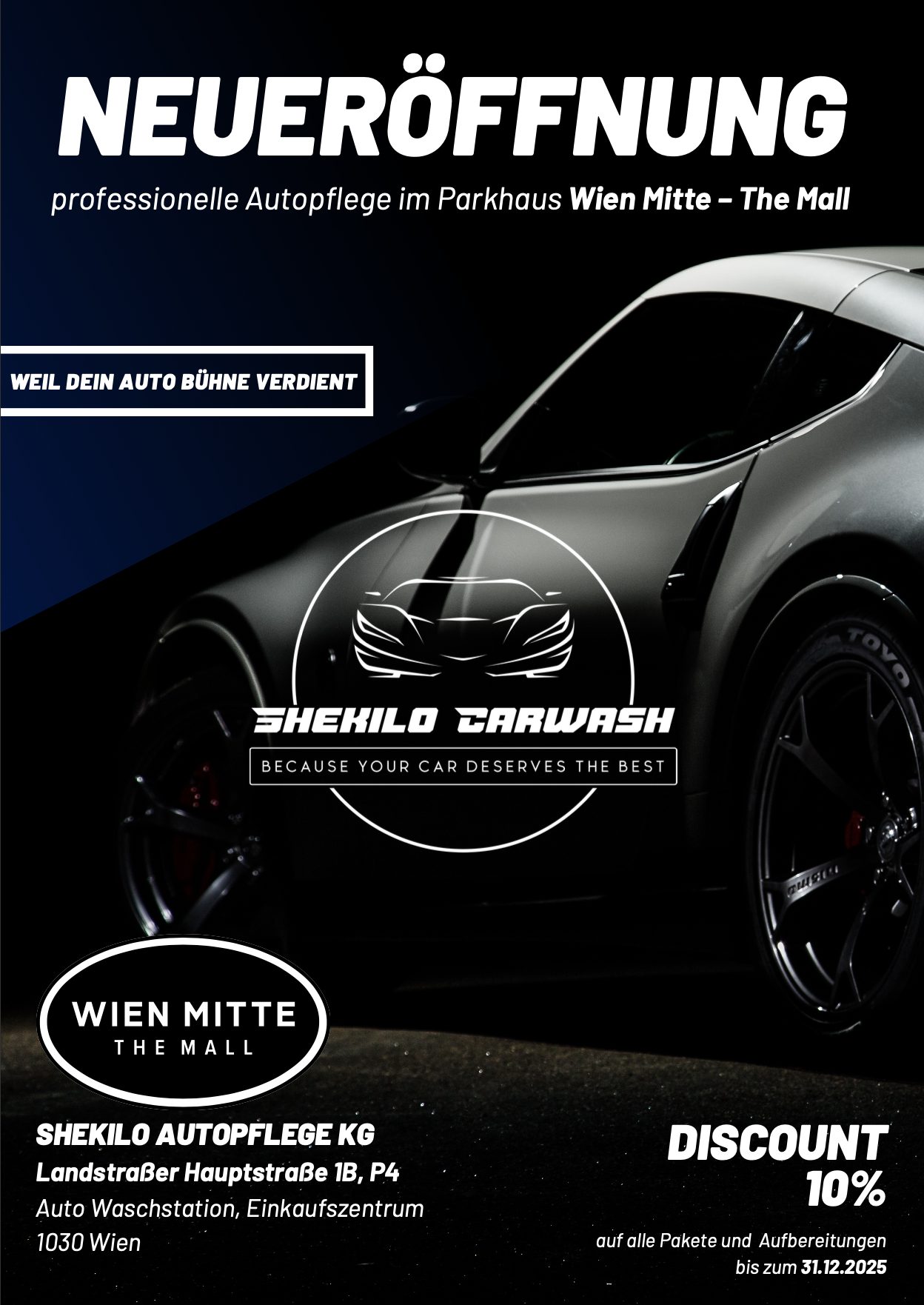 Zur Neueröffnung der professionellen Autopflege von SHEKILO AUTOPFLEGE KG im Parkhaus WIEN MITTE The Mall gibt es jetzt 10 % Rabatt auf alle Pakete und Aufbereitungen!