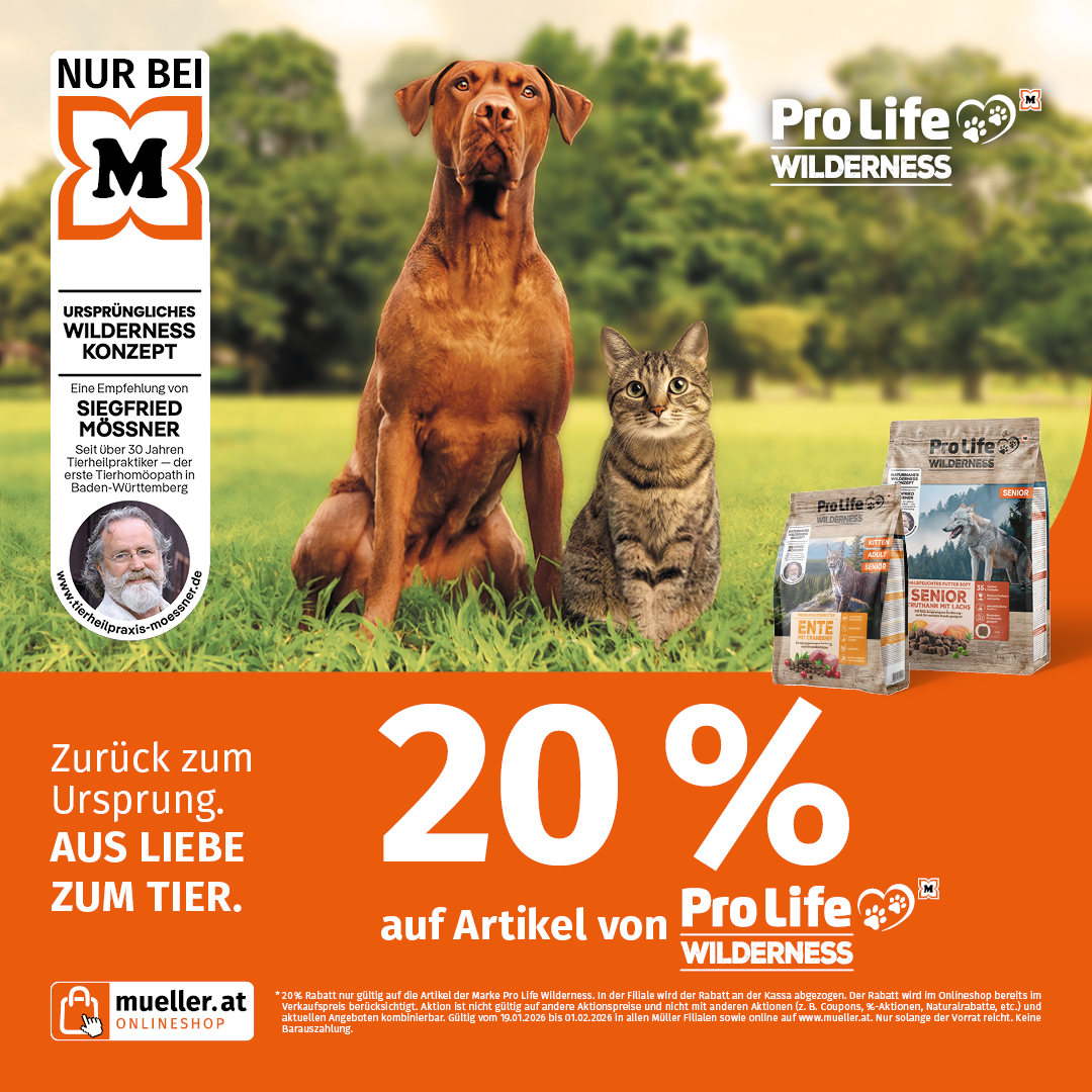 *20% Rabatt nur gültig auf Artikel der Marke Pro Life Wilderness. In der Filiale wird der Rabatt an der Kassa abgezogen, Nicht gültig auf andere Aktionspreise und nicht mit anderen Aktionen (z.B. Coupons, %-Aktionen, Naturalrabatte etc.) kombinierbar. Gültig vom 19.01.2026 bis 01.02.2026. Nur solange der Vorrat reicht. Keine Barauszahlung.