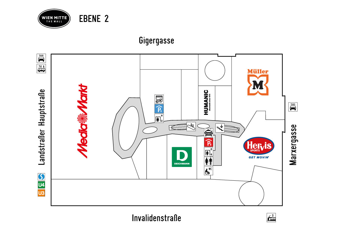 Das Einkaufszentrum befindet sich direkt am Verkehrsknotenpunkt Wien Mitte – Landstraße, in unmittelbarer Nähe von Stadtpark und Wiener Ringstraße, nur wenige Gehminuten vom Stephansplatz und dem historischen Stadtzentrum Wiens entfernt. WIEN MITTE The Mall ist mit öffentlichen Verkehrsmitteln rasch erreichbar, darunter 2 U-Bahn- und 5 Schnellbahn-Linien. Und für alle, die mit dem Auto kommen, gibt es mit 470 Stellplätzen ausreichend Parkmöglichkeiten.