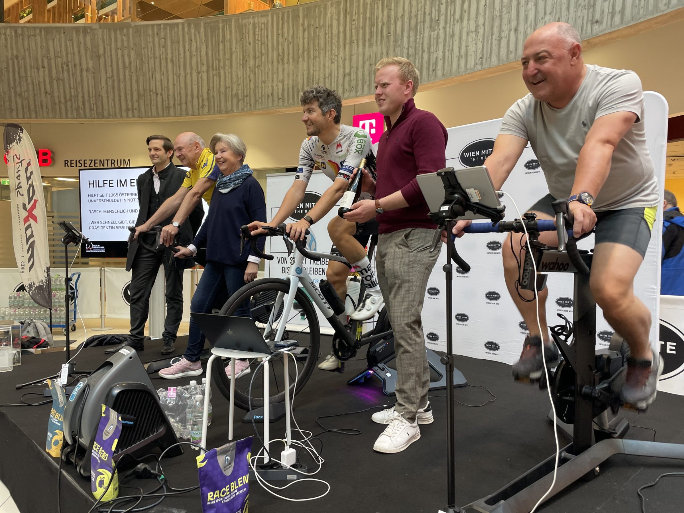 Für humorvolle Momente sorgten auch Rudi Roubinek und Gery Seidl, die nach ihren Slots noch weiter strampelten. Roubinek betonte: „In Zeiten wie diesen ist es besonders wertvoll, für eine so transparente Organisation wie ‚Hilfe im eigenen Land‘ zu spenden.“