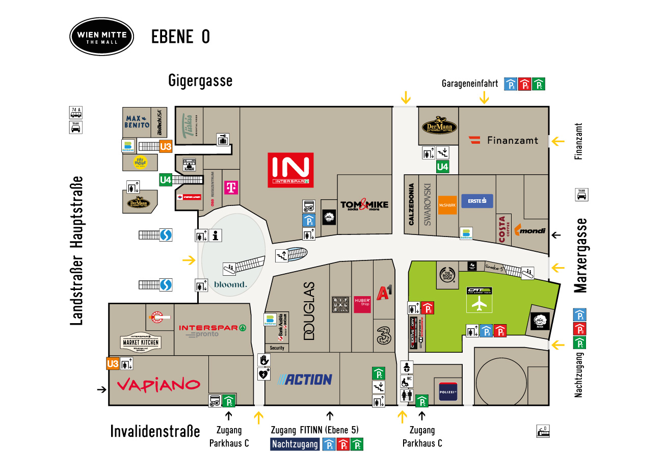 WIEN MITTE The Mall is located centrally, next to the Wien Mitte – Landstraße transport hub, the Stadtpark, and the Ringstraße and just a few minutes’ walk from Stephansplatz and the historic center of Vienna. The Mall is easily reached by public transport, with ten lines – including the CAT (City Airport Train) and two underground lines – converging at Wien Mitte. For those arriving by car, the 470-space-garage provides ample parking opportunities.